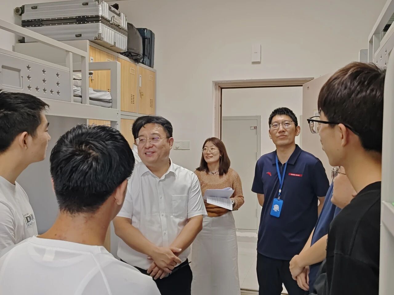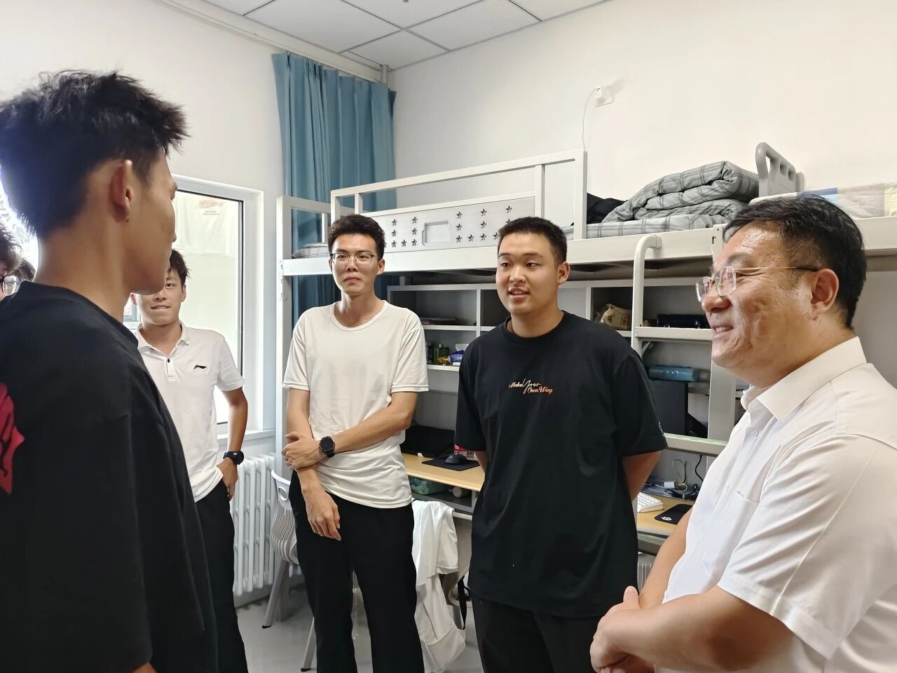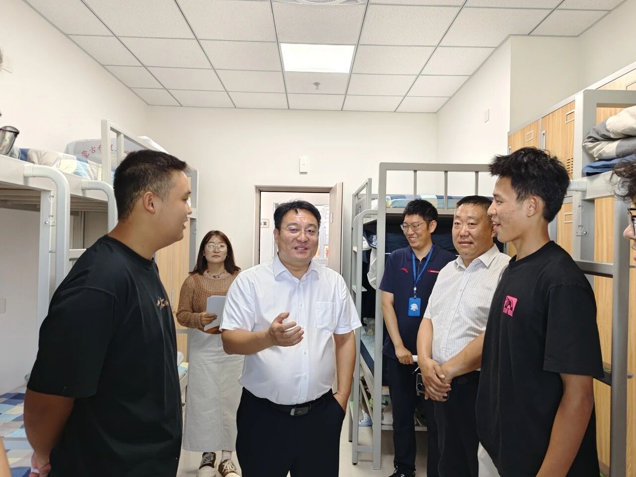 领导都与新生亲切交谈,详细询问他们的入学感受、生活需求及未来规划。在走访过程中,领导们仔细查看宿舍设施配备情况,叮嘱同学们注意用电安全、保持宿舍整洁,并鼓励大家尽快融入集体生活,建立良好室友关系,营造温馨和谐的宿舍氛围。