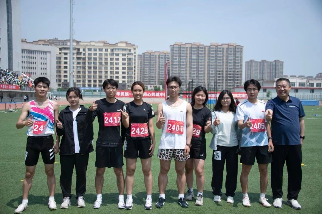 运动员们意气风发,与老师并肩而立,笑容灿烂。号码布在胸前闪耀,那是他们拼搏的勋章,背后是高楼与热烈的观众,见证着荣耀时刻。