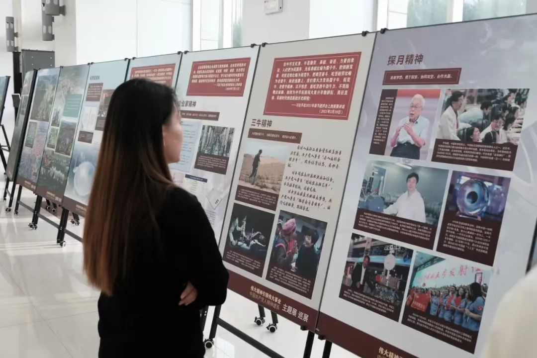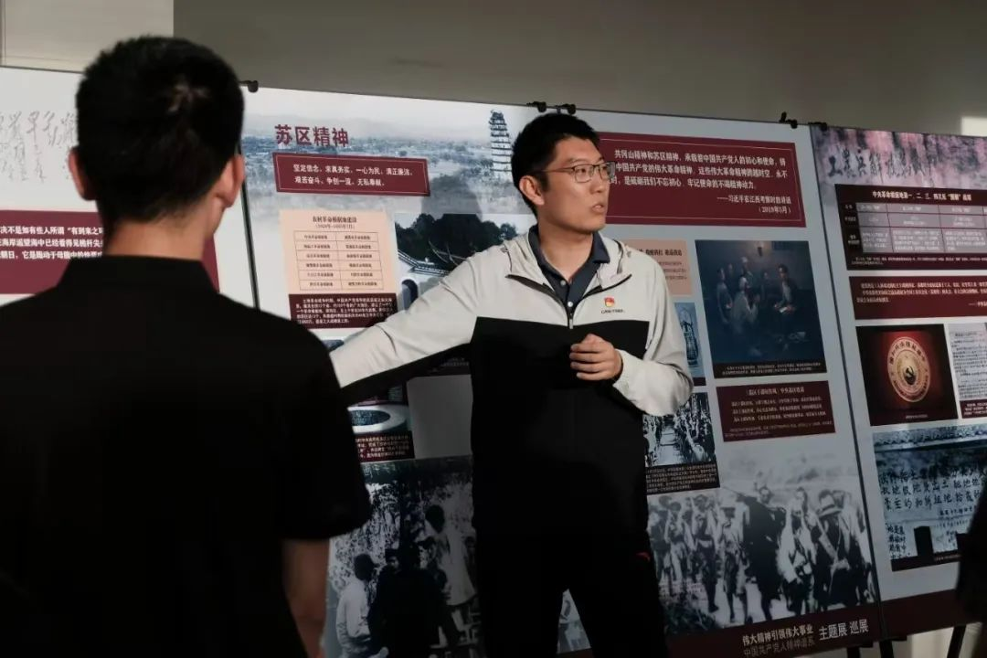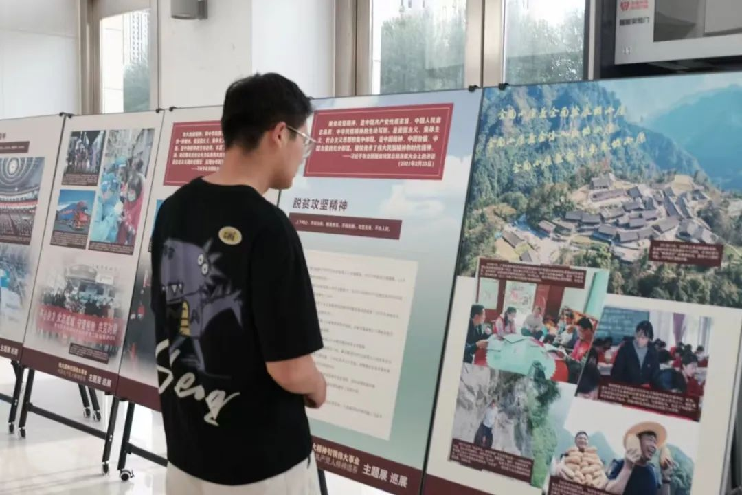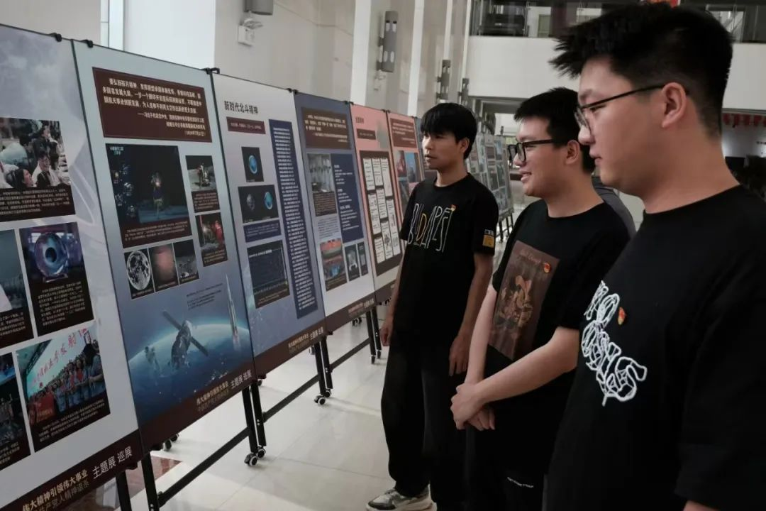 本科学生支部委员会于2025年6月4日晚6:30在逸夫楼一楼大厅开展党日活动,由院党委副书记冯佃臣书记及本科学生党支部书记韩聪一同志带领同学们参观以“伟大精神引领伟大事业——中国共产党人精神谱系”主题的巡展,并开展交流讨论,分享参观感悟与心得体会。